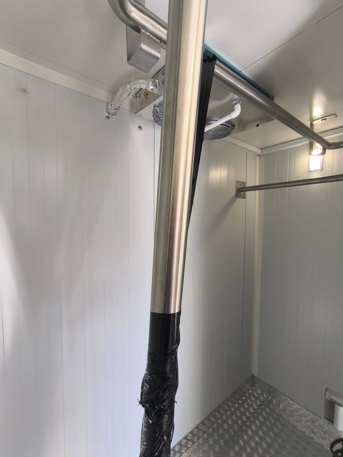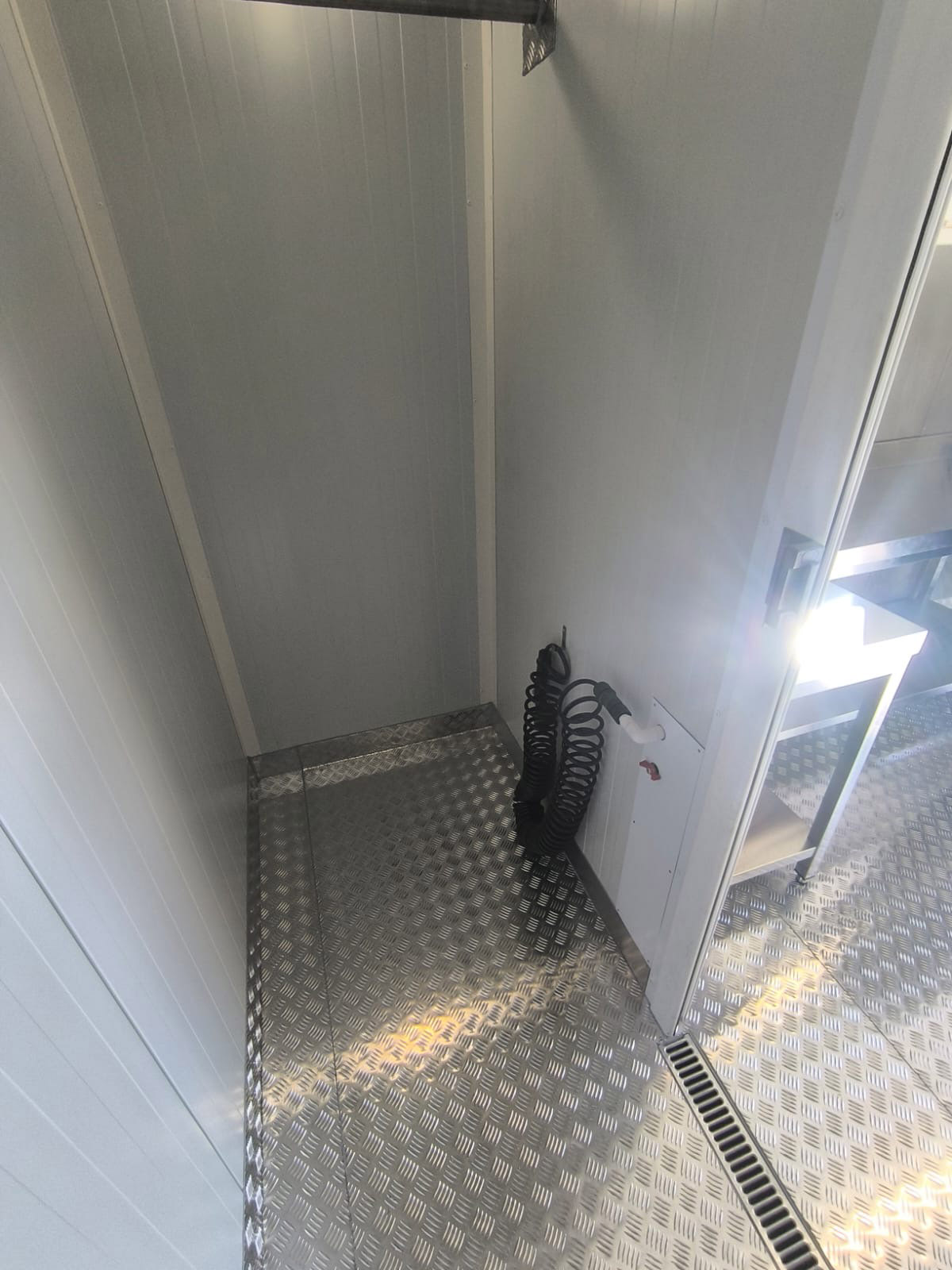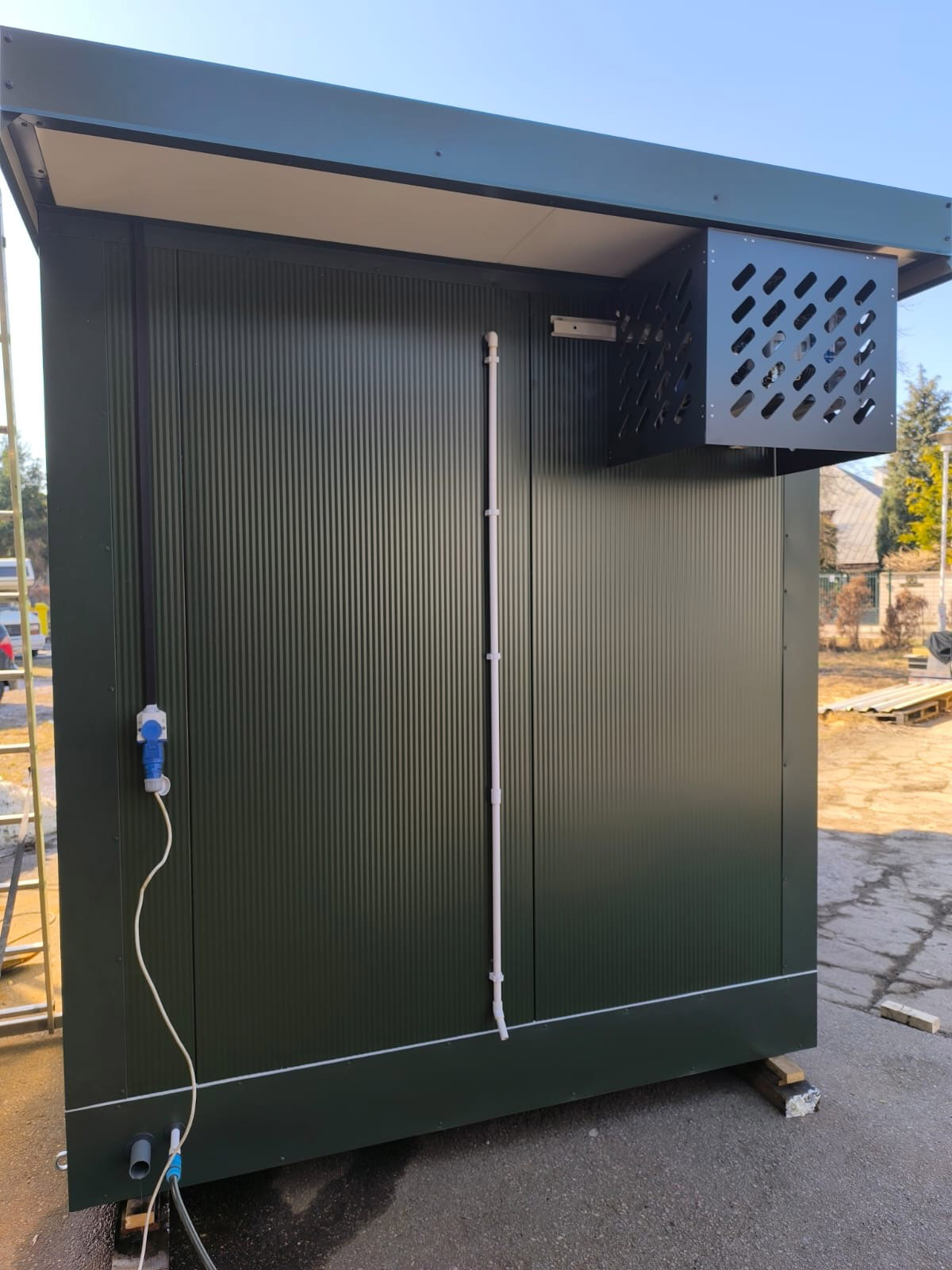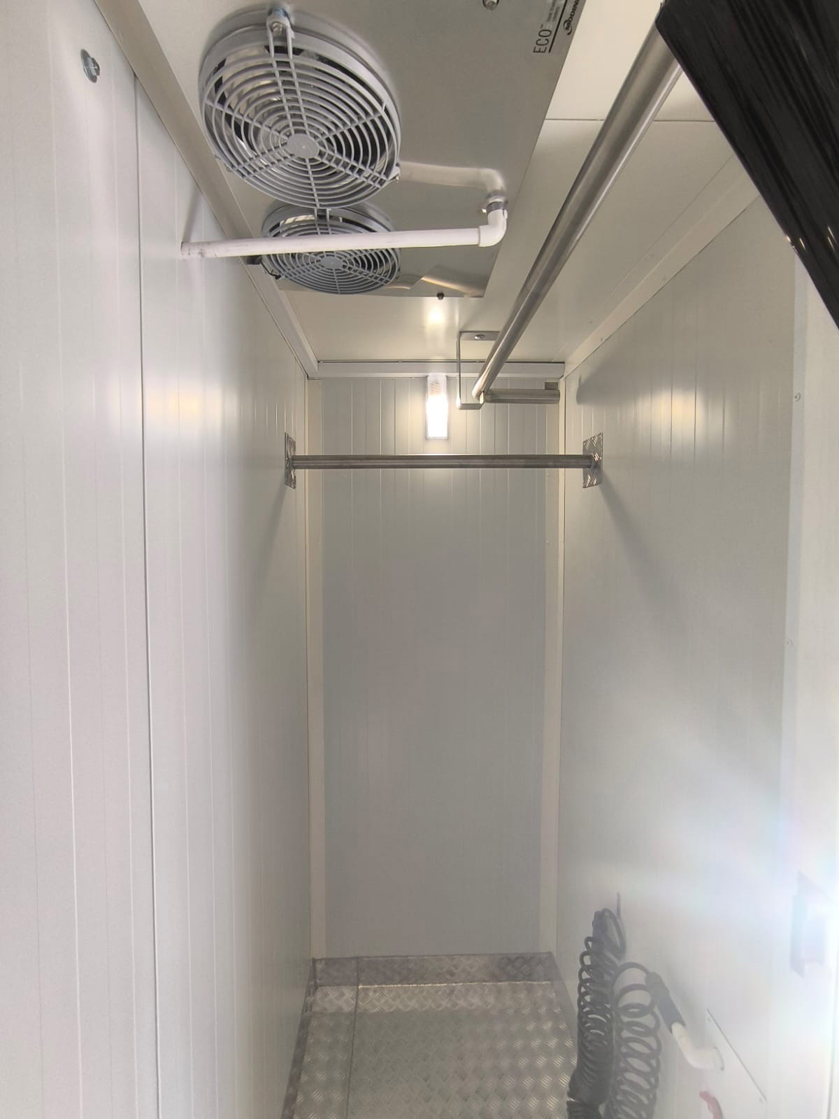 Standardmäßig umfasst jeder Container zwei Räume: einen Zerwirk- und einen Kühlraum. Dank des 150 cm langen Vordaches können Sie das Wild im Außenbereich komfortabel und witterungsgeschützt aufbrechen, aus der Decke schlagen oder abschwarten. Das Kühlaggregat ist auf eine Temperatur von +2°C einstellbar, sodass selbst Wildinnereien vorschriftsgemäß gelagert werden können. Grundsätzlich aber kann eine Temperatur im Bereich von -5°C bis +10°C erreicht werden.